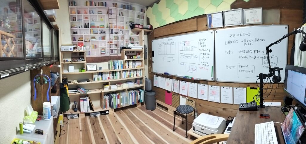 カフェ板をふんだんに使って床板、本棚を制作。そして、既存の本棚は作り替えて、サイズ調整した本棚へ。