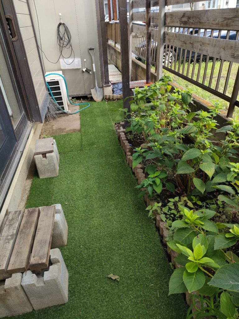 今までコンクリートの叩きの上に敷いていた人工芝は、駐車場と庭に敷いて、景観を向上しました。